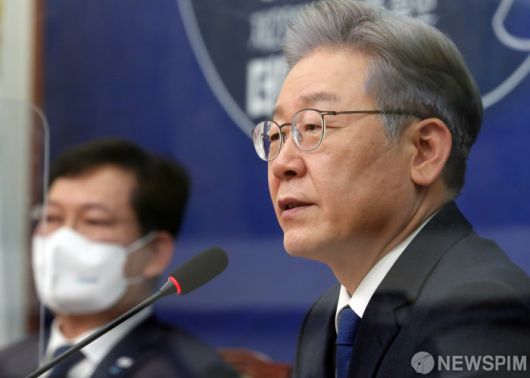 [서울=뉴스핌] 최상수 기자 = 더불어민주당 제20대 대통령후보로 선출된 이재명 경기도지사가 지난 11일 오후 서울 여의도 국회에서 열린 '당지도부-더불어민주당 대통령 후보 상견례'에서 모두발언을 하고 있다. 2021.10.11 kilroy023@newspim.com |