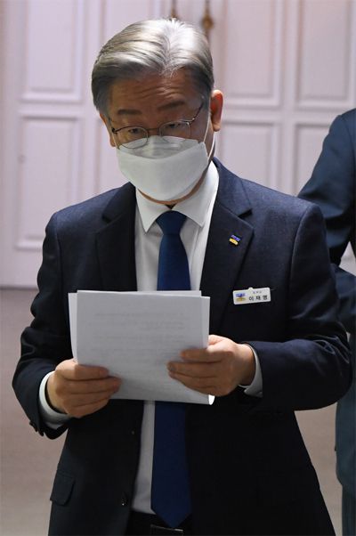 더불어민주당 제20대 대통령 후보로 선출된 이재명 경기도지사가 12일 오후 경기도 수원시 경기도청에서 긴급 현안 기자회견을 위해 브리핑룸으로 이동하고 있다. [사진 제공 = 연합뉴스] |