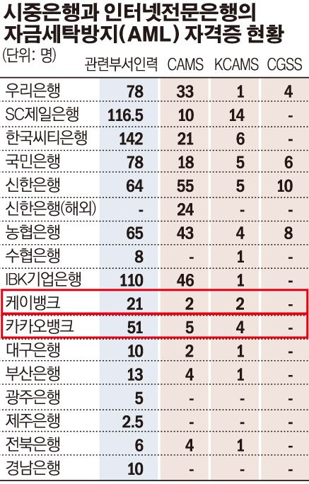 인터넷전문은행 또한 자금세탁방지 전문가가 극심히 부족한 것으로 나타났다. 케이뱅크·카카오뱅크 전사를 통틀어 자금세탁방지 자격증을 취득한 인력이 한손가락에 꼽히는 것으로 확인됐다. 자금세탁방지 업무를 맡고 있는 인력 또한 시중은행의 3분의 1 수준에 불과하다. 특히 가상자산 거래소에 실명계좌를 내주며 자금세탁 문제가 생길 시 책임을 은행이 온전히 져야 하는 상황에서, 자금세탁범죄가 발생시 제대로 대응할 수 있는지 우려 또한 제기되고 있다.