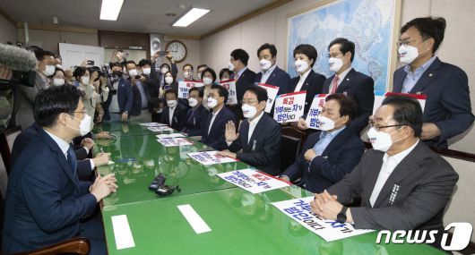 (수원=뉴스1) 국회사진취재단 = 국민의힘 김도읍 정책위의장 등 국회 정무·행안·국토위원회 소속 의원들이 13일 오전 2021년 국정감사에서 경기도와 성남시의 자료제출 비협조에 대한 항의로 경기도 수원시 팔달구 경기도청을 방문해 오병권 행정1부지사와 대화하고 있다. 2021.10.13/뉴스1kkorazi@news1.kr[© 뉴스1코리아(news1.kr), 무단 전재 및 재배포 금지]