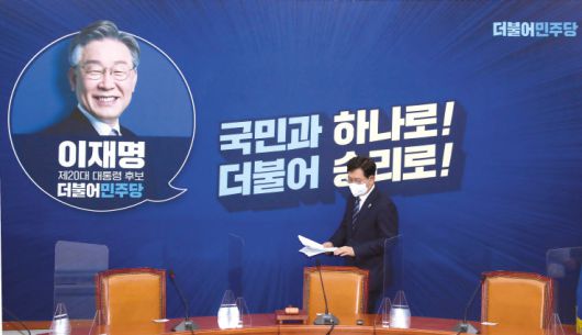 송영길 더불어민주당 대표가 13일 오전 국회 본청 당 대표회의실에서 열린 최고위원회의에 참석하고 있다. 이낙연 경선 후보 측에서 무효표처리를 두고 이의제기를 한 가운데, 이지사를 민주당 대선 후보로 명시한 커다란 백드롭(배경판)이 눈길을 끈다. 이상섭 기자 |