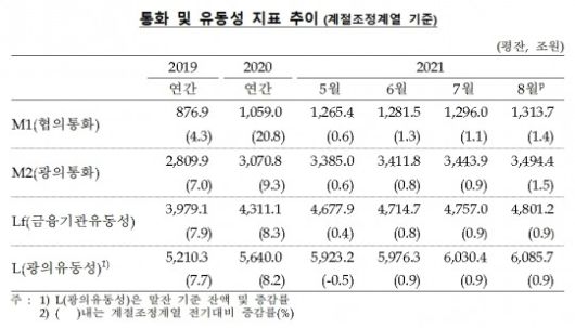 통화 및 유동성지표 추이 / 자료제공= 한국은행(2021.10.13) |