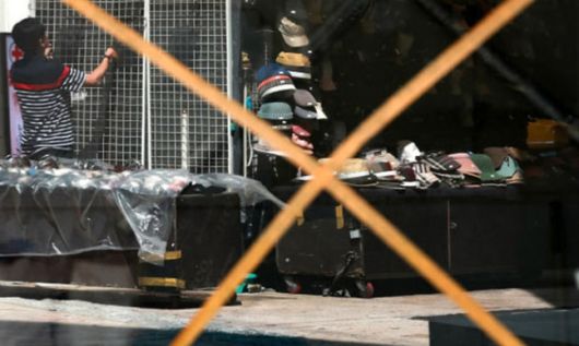 서울 중구 명동 거리의 한 폐업 매장 쇼윈도에 부착된 ''X''표 스티커 너머로 가로가판대 장사를 준비하는 상인의 모습이 비치고 있다. 연합뉴스 |