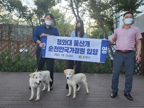 (순천=연합뉴스) 형민우 기자 = 전남 순천시는 청와대로부터 풍산개 한 쌍을 분양받아 순천만국가정원에서 키우게 됐다고 14일 밝혔다.