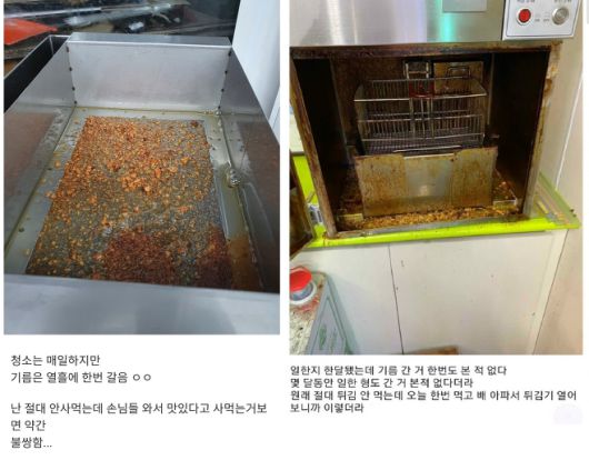A씨는 “최소한 한 달 동안은 (튀김기를) 안 닦았다”며 “기름도 일주일에 한 번 정도 갈았다. 사장은 별로 신경을 안 쓰더라. 도대체 왜 이걸 이렇게 내버려두는지 옳지 않다는 생각이 들었다”고 말했다.