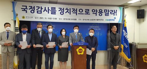 (수원=연합뉴스) 이우성 기자 = 경기도의회 더불어민주당은 다음 주 예정된 두 차례 경기도 국정감사를 정치적인 목적으로 악용하려는 시도를 중단하라고 15일 요구했다.