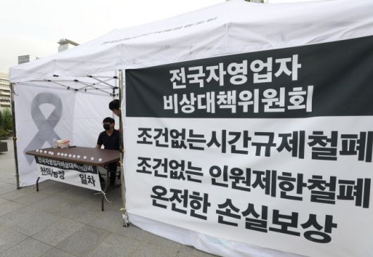 10월 7일 오후 서울 종로구 세종로공원에 전국자영업자비상대책위원회 회원들이 천막에서 농성을 하고 있다.(사진=뉴스1) |