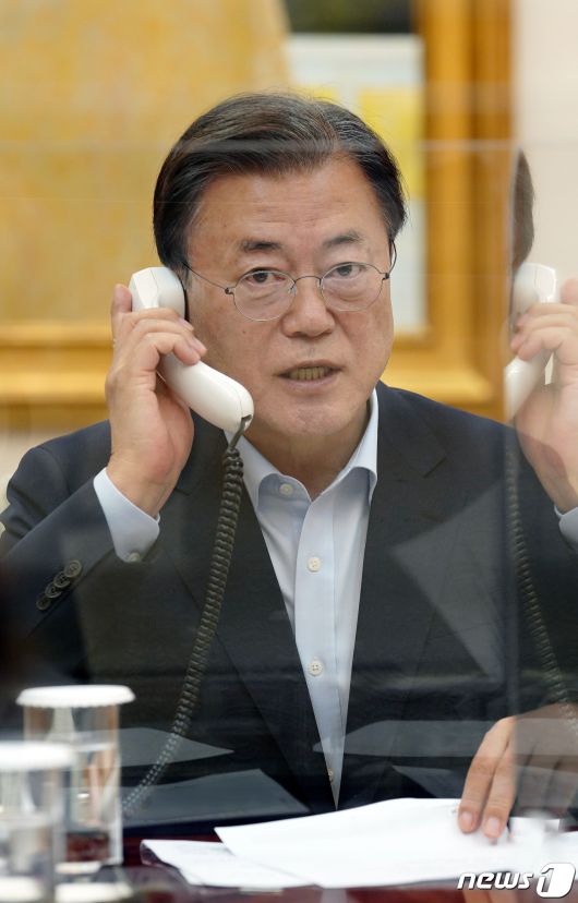 (서울=뉴스1) = 문재인 대통령이 15일 청와대 관저 회의실에서 기시다 후미오 일본 총리와 통화하고 있다.(청와대 제공) 2021.10.15/뉴스1