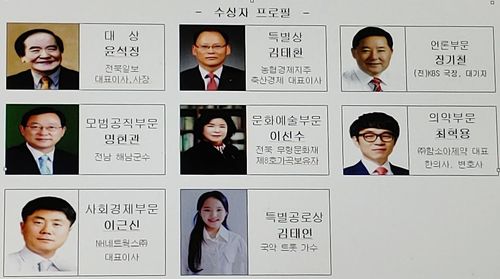 언론 부문은 장기철 전 KBS 국장, 모범공직 부문은 명현관 전남 해남군수, 문화예술 부문은 이선수 전북 무형문화재 보유자가 선정됐다.