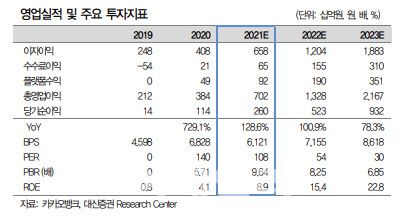 박혜진 대신증권 연구원은 “목표주가는 2025년 자기자본이익률(ROE)/요구수익률(COE) 방식으로 산정한 적정 주가순자산비율(PBR) 6.3배를 적용, 기업가치가 41조4000억원에 이를 것이라 판단해 목표가를 제시한다”면서 “할인율은 카카오뱅크의 COE를 적용했다”고 설명했다.