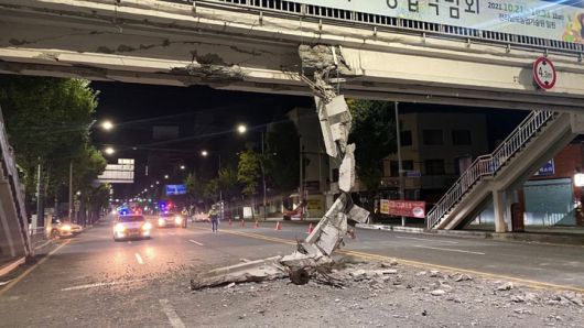 [광주=뉴시스] 변재훈 기자 = 18일 오전 4시30분께 광주 북구 북동 모 초등학교 앞 육교에 건설 중장비인 집게차가 충돌했다. 이 사고로 약 4.3m 높이 교량 하부 콘크리트 구조물이 파손돼 도로로 추락하고 일부 균열이 발생, 행정당국이 응급 복구에 나섰다. (사진=독자 제공) 2021.10.18. photo@newsis.com *재판매 및 DB 금지 |