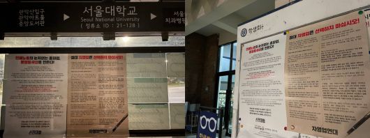 자영업연대 역시 이날 부착한 대자보를 통해 코로나19로 인한 자영업자들의 열악한 실태를 호소했다. 자영업연대는 “대학생 여러분, 절대 자영업은 선택하지 마십시오”라며 “‘치킨 게임’은 오징어 게임 속 잔혹한 묘사보다 훨씬 더 매섭다. 자영업자에게는 조금 더 불리하고 공정하지 않은 룰이 적용되는 곳이 바로 2021년 대한민국”이라고 지적했다.