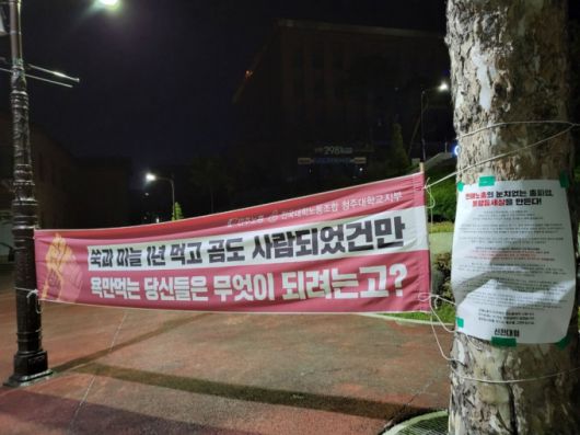 신전대협과 자영업자들이 18일 오전 충북 청주시 청주대학교 내 게시한 플래카드. /사진제공=신전대협 |