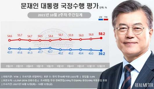 이번 조사 결과는 지난 조사(10월 1주차) 결과에 비해 0.8%포인트(p) 하락한 수치다. 지난 조사에선 긍정평가 수치가 40%였다. 문 대통령 지지율이 40% 밑을 기록한 건 6월 5주차 조사(38.0%) 이후 14주 만이다.