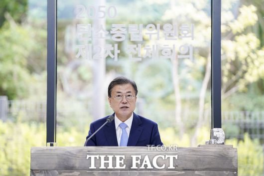 [더팩트ㅣ허주열 기자] 문재인 대통령이 18일 오후 서울 용산구 노들섬에서 열린 '2050 탄소중립위원회 제2차 전체회의'에 참석해 탄소중립을 향한 강력한 의지를 표명했다. 특히 2030 온실가스 감축목표(NDC)를 대폭 상향하는 안과 관련해선 '역사적인 발표'라고 높이 평가했다.