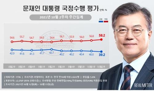 문 대통령의 국정 수행을 부정적으로 평가한 비율은 일주일 만에 1.4%포인트 상승한 58.2%였다. 이에 문 대통령 국정 수행 평가의 긍·부정 격차는 한 주 전보다 2.2%포인트 더 벌어진 19%포인트가 됐다.