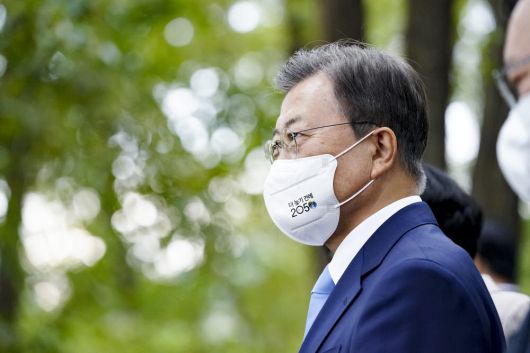 문재인 대통령이 18일 오후 서울 용산구 노들섬에서 열린 2050 탄소중립위원회 제2차 전체회의를 마친 후 맹꽁이 숲을 탐방하고 있다. 연합뉴스 |