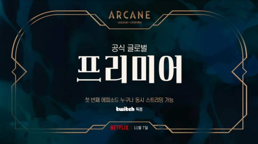 라이엇 게임즈가 리그 오브 레전드(LoL) 지식재산권(IP)을 활용해 제작한 넷플릭스 애니메이션 시리즈 아케인(ARCANE)을 11월 7일 넷플릭스와 트위치에서 전세계 동시 공개한다. 아케인은 트위치에서 독점으로 동시 중계되는 최초 넷플릭스 시리즈가 된다.