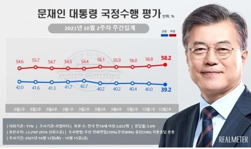 리얼미터가 YTN 의뢰로 지난 12∼15일 전국 18세 이상 2022명을 대상으로 조사한 결과, 응답자의 39.2%가 문 대통령의 국정 수행을 긍정적으로 평가했다. 이는 1주일 전인 지난 조사에 비해 0.8%포인트 하락한 수치로, 6월 5주차(38.0%) 이후 14주 만에 30%대로 떨어졌다.