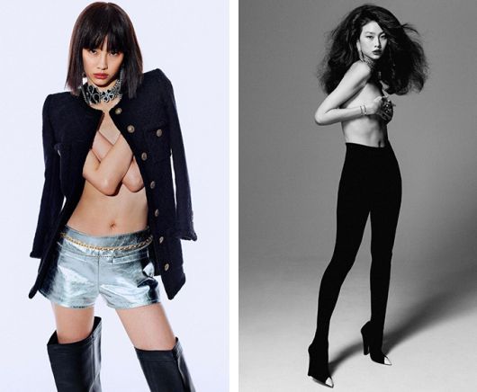 사진 속 정호연은 맨몸에 커다란 초커 목걸이와 트위드 재킷을 걸친 채 양 팔로 가슴을 가린 포즈를 취하고 있다. 그는 메탈릭한 소재의 핫팬츠에 싸이하이부츠를 신고 칼단발 머리로 시크한 분위기를 완성했다.