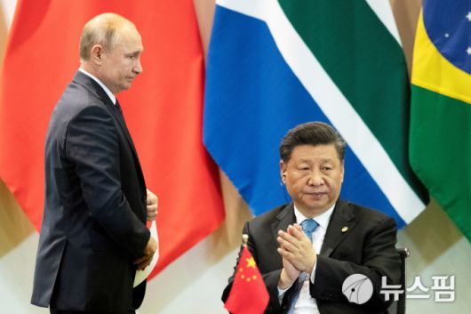 블라디미르 푸틴 러시아 대통령(좌)과 시진핑 중국 국가주석이 브라질 브라질리아에서 열린 브릭스 11차 정상회의 중 신개발은행 관련 회의에 참석했다. 2019.11.14 [사진=로이터 뉴스핌] |