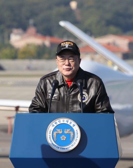 문 대통령은 공군 전투조종사복장에 검정색 가죽점퍼, 공군모자, 선글라스 차림으로 전투기에서 내렸다. 문 대통령은 “우리 기술로 개발한 FA-50의 늠름한 위용을 직접 체감할 수 있었다”며 “FA-50은 고등훈련과 전투, 정밀 폭격이 모두 가능하고 가격 면에서도 높은 가성비가 입증된 뛰어난 경공격기다. 세계로 수출되고 있으며 우리의 영공을 굳건히 지키고 있다”고 말했다.