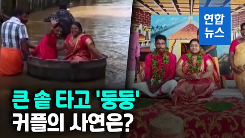 (서울=연합뉴스) 홍수로 길이 물에 잠기자 대형 솥을 타고 결혼식장으로 향한 인도 커플이 화제입니다.
