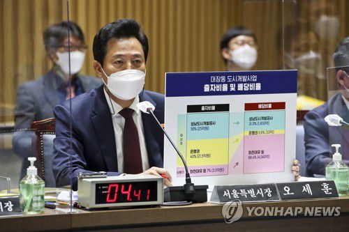 20일 서울시청에서 열린 국회 국토교통위원회의 서울시 국정감사에서 오 시장은 국민의힘 송언석 의원이 대장동 개발에 참여한 민간사업자인 화천대유와 천화동인이 적은 지분에도 막대한 배당금을 받아 간 것에 대한 의견을 묻자 '대장동 도시개발사업 출자비율 및 배당비율'이라고 적힌 설명 팻말을 꺼내 들며 "서울시는 절대 저런 사업구조를 짜지 않는다"고 답했다.