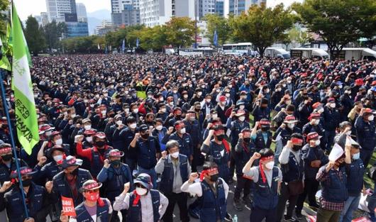[부산=뉴시스] 하경민 기자 = 민주노총 부산지역본부 조합원 1만여명(주최 측 추산)이 20일 오후 부산 부산진구 송상현광장에서 열린 총파업대회에 참석해 구호를 외치고 있다. 2021.10.20. |