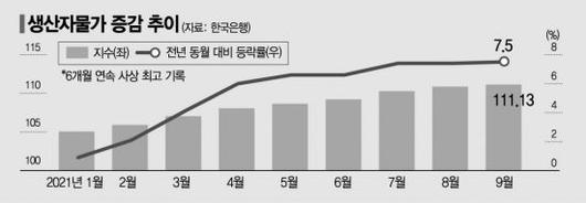 한국은행이 20일 발표한 ‘9월 생산자물가지수는 111.13(2015년 100 기준)로 전월 대비 0.2% 올라 1965년 1월 통계 작성 이래 역대 최고치를 기록했다. 생산자물가지수는 국내생산자가 국내시장에 공급하는 상품과 서비스의 가격 변동을 측정하는 통계로 소비자물가에 영향을 미치는 요인이다.