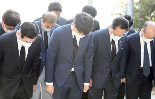 국민의힘 이준석 대표(왼쪽 두번째)가 21일 오전 전남 여수시 만흥동 여순사건 희생자 위령비를 찾아 묵념하고 있다. [연합] |
