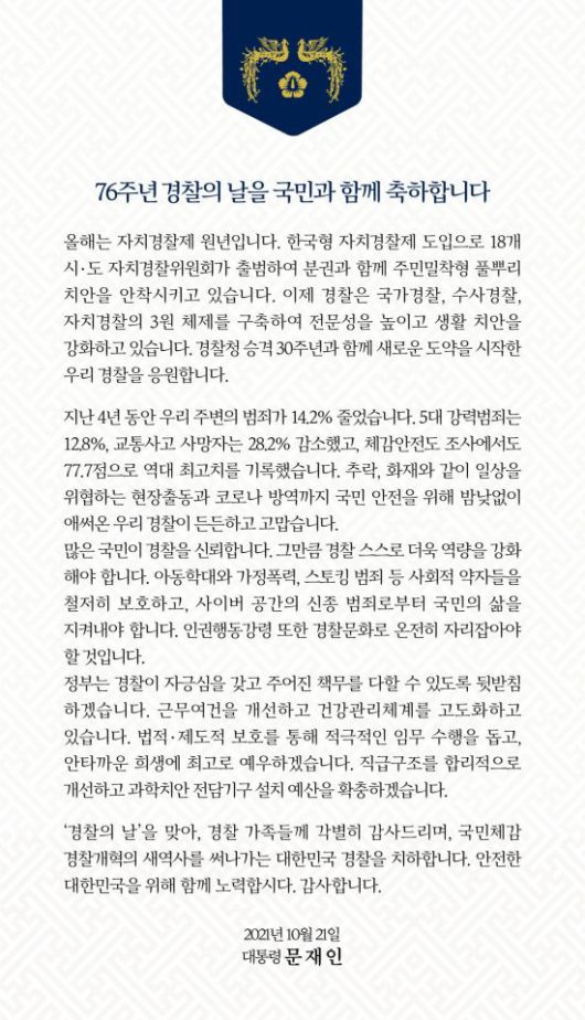 문 대통령은 "한국형 자치경찰제 도입으로 18개 시·도 자치경찰위원회가 출범하여 분권과 함께 주민밀착형 풀뿌리 치안을 안착시키고 있다"며 "경찰청 승격 30주년과 함께 새로운 도약을 시작한 우리 경찰을 응원한다"고 밝혔다.