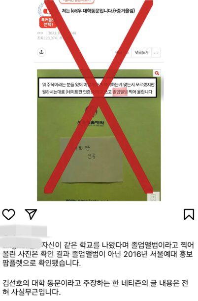 [OSEN=장우영 기자] 배우 김선호가 사생활 논란을 사과한 가운데 그의 학교 동문이라 주장하는 네티즌의 폭로글은 ‘사실무근’이었다. 이 가운데 김선호의 대학 동문이라는 이들의 증언이 이어지고 있다.