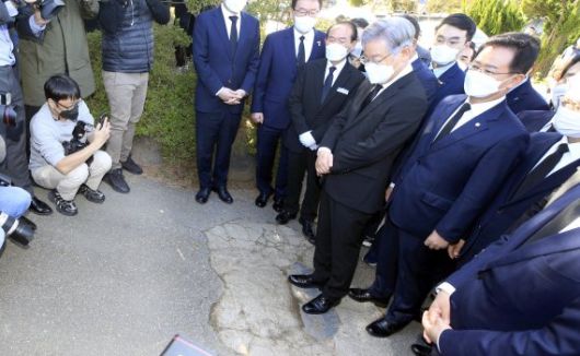 이낙연 전 국무총리는 2018년 5월 전두환 비석을 밟았다. [사진=연합] |