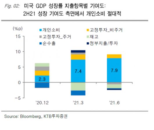 소비 확대 추세가 코로나19 델타 변이 영향과 정책 효과 소멸로 기대에 미치지 못한 영향으로 풀이된다. 박석현 KTB투자증권 투자전략팀장은 "1,2분기 미국 GDP 성장률에 있어 개인 소비가 각각 7.4%포인트, 7.9%포인트 기여하면서 절대적인 영향을 끼쳤는데 3분기에는 소비경기 정체가 GDP 성장률을 낮추는 데 결정적인 영향을 미쳤을 것"이라고 설명했다.