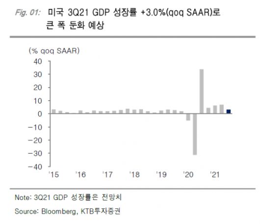 23일 KTB투자증권은 이 같이 분석했다. 다음주 미국과 우리나라의 국내총생산(GDP) 성장률 결과가 발표될 예정이다. 미국의 경우 부진이 예상된다. 올해 상반기 연율 기준 성장률 1분기는 6.3%, 2분기는 6.7%ㅇ를 기록했지만 3분기에는 3.0%로 크게 둔화될 것으로 보인다.