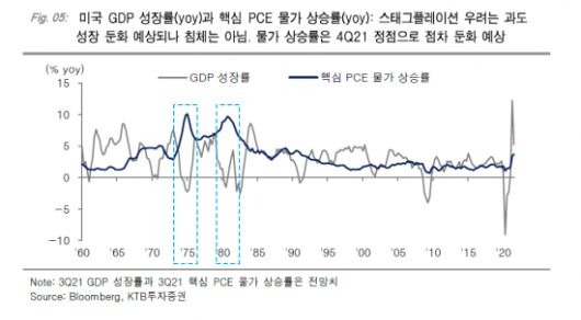 하지만 이 역시 일시적인 성격이 강하다고 판단했다. 향후에도 견고한 성장세가 이어질 것으로 전망되고 있다는 측면에서 경기 침체 수반을 의미하는 스태그플레이션 우려는 과도하다는 것이다. 박 팀장은 "물가 상승률 역시 지속적인 상승보다는 4분기를 지나면서 점차 둔화가 예쌍된다"며 "다음주 경제 성장률이 큰 폭으로 둔화하고 물가 상승률이 고점을 경신해도 과민하게 반응할 필요는 크지 않을 것"이라고 설명했다.