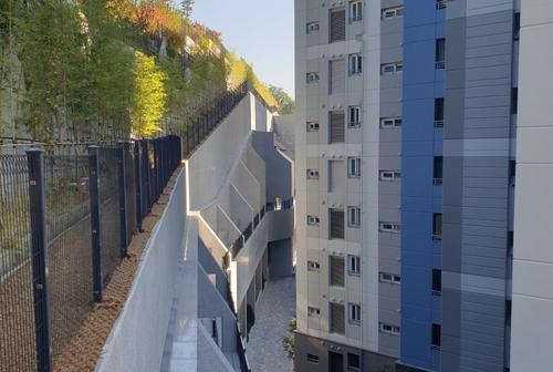 성남시도 "전체 사업부지 중 5만8천838㎡(R&D센터 부지 2만4천943㎡ 포함)를 기부채납 받으며 민간임대에서 분양주택으로 변경됐다"며 "아파트가 경사지에 세워져 비탈면(옹벽)이 높아 보이는데 실제 아파트 비탈면의 수직높이는 산지관리법이 정한 15m 이하라 문제가 없다"고 말했다.