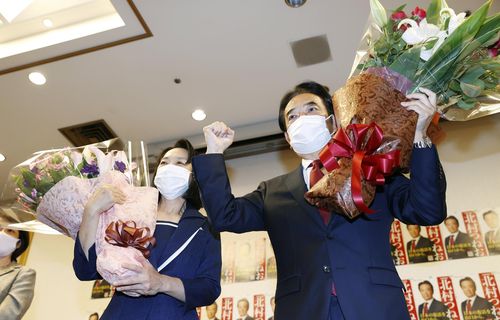 (야마구치 교도=연합) = 24일 치러진 일본 참의원 야마구치 선거구 보선에서 당선한 자민당 기타무라 쓰네오(北村経夫·66) 후보가 꽃다발을 들고 기뻐하고 있다. |
