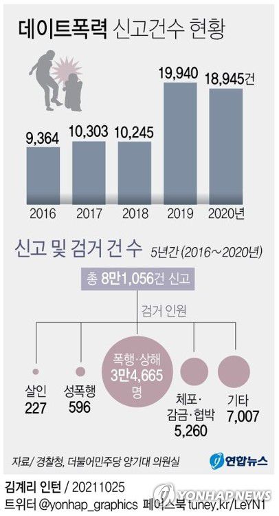 (서울=연합뉴스) 이정현 기자 = 최근 5년간 전국에서 데이트폭력 신고가 8만건 이상 접수됐고, 그중 살인으로만 227명이 검거된 것으로 파악됐다.