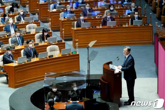 (서울=뉴스1) 유승관 기자 = 문재인 대통령이 28일 서울 여의도 국회 본회의장에서 2021년도 예산안 시정연설을 하고 있다. 2020.10.28/뉴스1 |