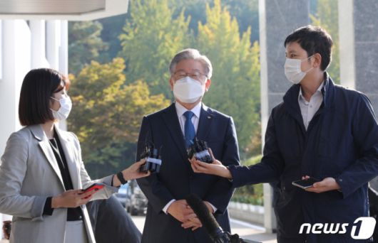 (수원=뉴스1) 김영운 기자 = 더불어민주당 대선 후보인 이재명 경기도지사가 25일 오전 경기도 수원시 팔달구 경기도청으로 출근을 하던 중 취재진들의 질문에 답하고 있다. 이재명 지사는 이날 오전 지사직 사퇴 기자회견을 열고 본격적인 대선 행보에 나설 예정이다. 2021.10.25/뉴스1 |