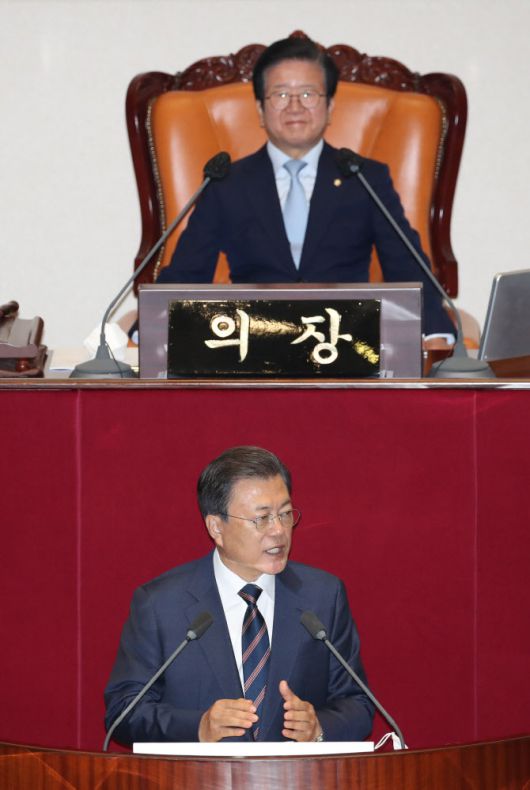 문재인 대통령이 25일 국회 본회의장에서 2022년도 예산안 시정연설을 하고 있다.(사진=연합뉴스) |