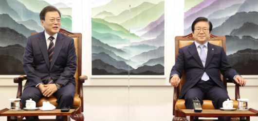 [이데일리 이정현 기자] 문재인 대통령이 25일 “일상회복이라는 희망의 문턱에 섰다”며 코로나19 극복을 위한 협력을 국회에 당부했다. 박병석 국회의장은 “앞으로도 청와대가 국민의 대표기관인 국회와 긴밀히 소통하고 협력하는 모습이 이어졌으면 좋겠다”고 답했다.