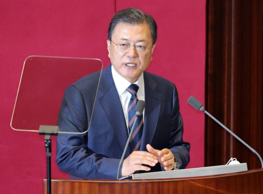 문재인 대통령이 25일 서울 여의도 국회 본회의장에서 2022년도 예산안 시정연설을 하고 있다. 임기 중 마지막 시정연설을 한 문 대통령은 “마지막까지 위기 극복에 전념하며 완전한 일상회복과 경제회복을 이루는 데 최선을 다하겠다”고 밝혔다.