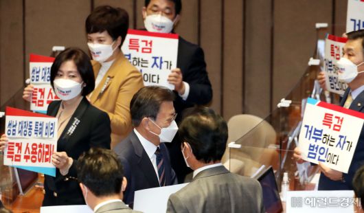 [헤럴드경제=이상섭 기자] 문재인 대통령이 25일 오전 국회 본회의장에서 2022년도 예산안 시정연설을 마치고 회의장을 나서는 동안 국민의힘 의원들이 대장동 관련 특검 수용을 요구하는 피켓을 들고 있다. |