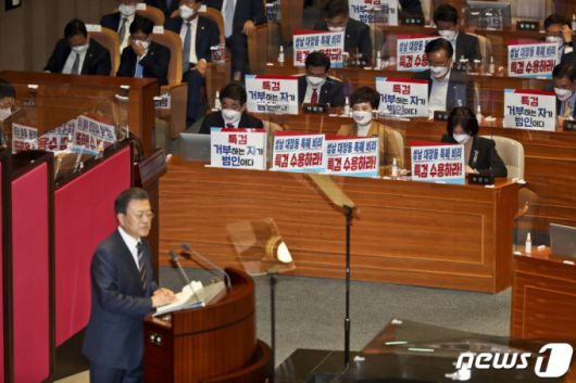 25일 서울 여의도 국회 본회의장에서 문재인 대통령이 2022년도 예산안 시정연설을 하고 있는 가운데 야당 의원들이 피켓팅을 하고 있다. /사진=뉴스1 |