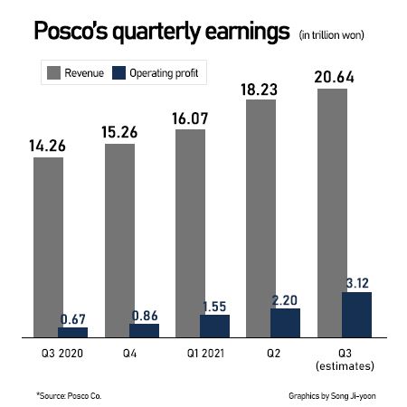 In its regulatory filing on Monday, the steelmaker reported that it raked in 3.12 trillion won ($2.66 billion) in operating income on a consolidated basis for the third quarter, matching its guidance released earlier this month. The operating profit rose 41.82 percent from three months ago and 365.67 percent from a year ago.