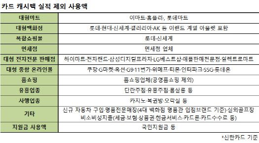 상생소비지원금은 10~11월 한 달 간 카드사용액이 2분기 월평균보다 3% 이상 많을 경우 증가분의 10%를 되돌려주는 방식이다. 하지만 실적에서 제외하는 사용처가 적지 않아 환급을 받기 위한 전략이 요구되고 있다. 사업 신청자 중 한명인 A씨의 카드 결제 인정 내역을 토대로 살펴봤다. 신한카드를 주카드로 지정한 A씨의 2분기 월평균 카드 사용 인정액은 약 135만원이다.