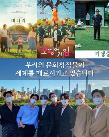 문 대통령은 이날 국회에서 한 2022년 예산안 시정연설에서 "K-팝과 드라마, 영화, 게임, 웹툰 등 우리 문화가 세계를 매료시켰다"며 영화 미나리와 기생충, 넷플릭스 한국 오리지널 드라마 오징어게임의 포스터가 나온 화면을 띄웠다.